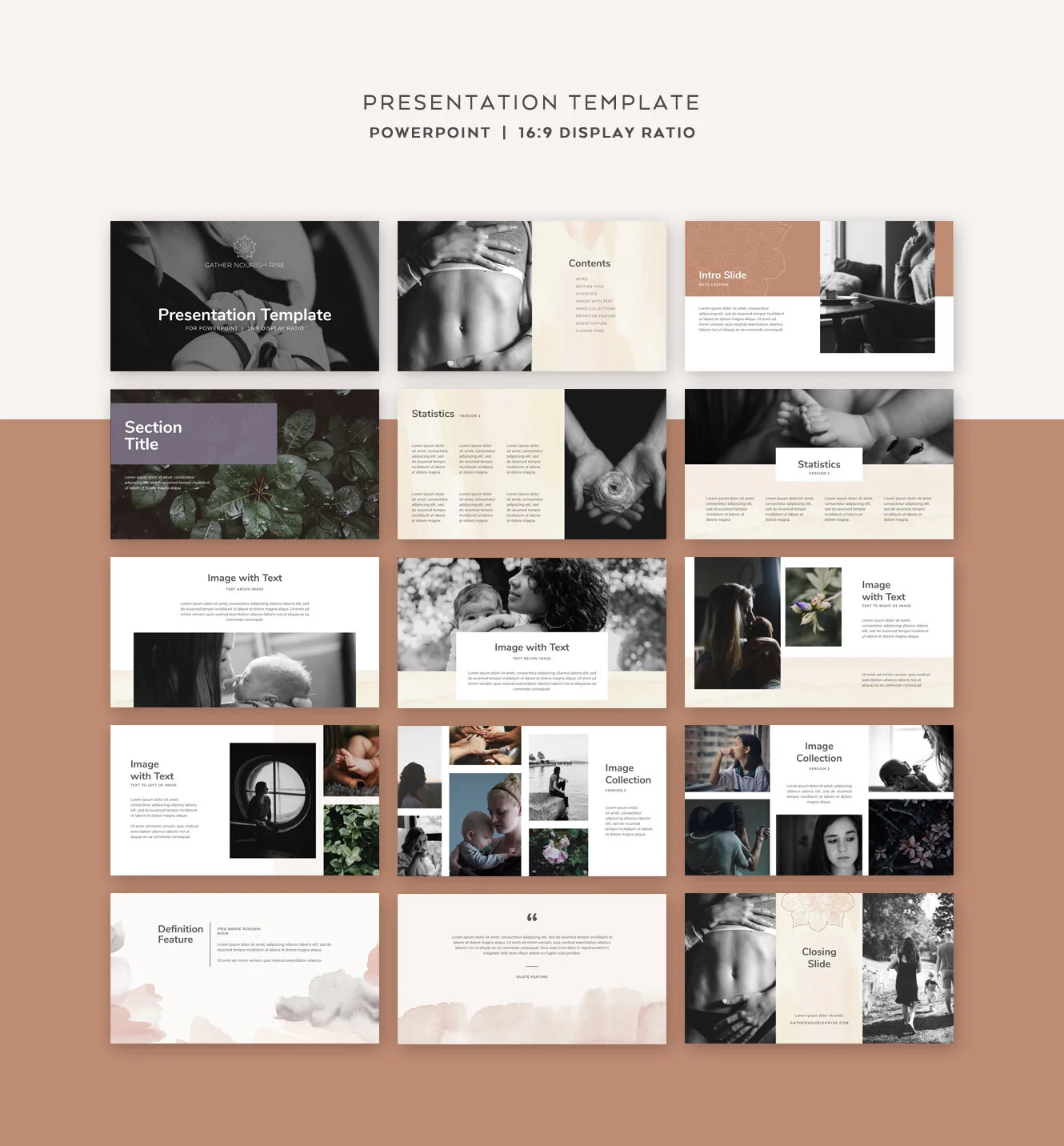 As part of the Gather Nourish Rise brand style guide, I included guidance on photography and social media styling. I also designed a series of templates that used the brand graphics.