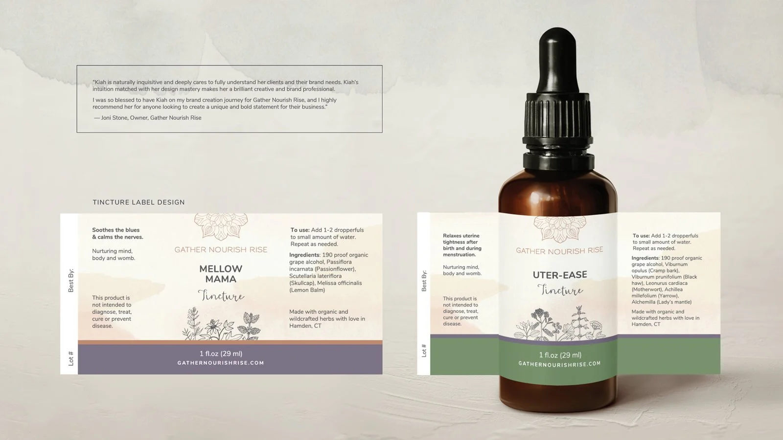 Gather Nourish Rise makes products designed to help alleviate stress and facilitate wellness. I designed the packaging for their teas, tinctures, and inhalers.